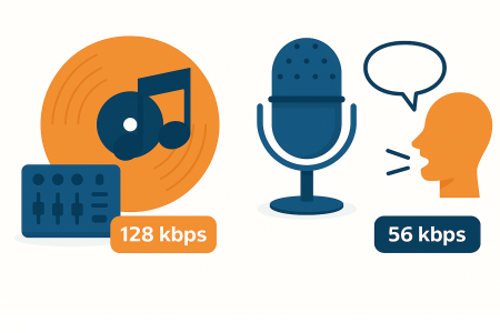 - Talk: 48 to 64 kbps, mono or AAC low-bitrate stereo, no crossfade, speech-optimized mic